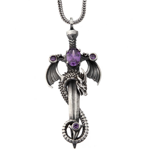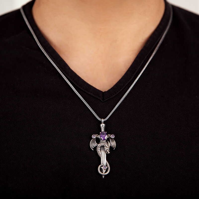 Silver Amethyst Dragon Sword Necklace The dragon sword is a Japanese symbol often associated with Japanese culture and history. The dragon sword has a long and complex history. Its first mention was found in a book called "Kojiki" during the early Edo period (1603-1868). In this story, the god Susanoo finds two swords, one named "Totsuka" and the other "Amakuni." He takes them to his brother Izanagi, who considers them symbols of power. These swords are given to Izanagi's son Amaterasu. The dragon sword was also used as their main weapon by samurai warriors in feudal Japan. They believed they could use these swords to defeat any enemy they faced on the battlefield. The dragon sword is also an important symbol in Chinese culture. It is a symbol of power, strength, and good luck; it is close to its Japanese meaning. The dragon sword has been a part of East Asian cultures for centuries. The dragon sword is said to have been given to the Yellow Emperor by a mysterious old man from the East Sea. The dragon sword was passed down from generation to generation to be used by emperors and heroes in times of need. The dragon sword has been considered an object of art since the Han dynasty. It was often decorated with gold or silver and featured elaborate designs on the blade. The dragon sword was also used in ceremonies, where it would be carried by a high-ranking official or general to symbolize power and prestige. This specially designed silver amethyst stone dragon sword necklace for men is made of 925 sterling silver. The silver is oxidized. Oxidized silver gives men's necklaces an aged appearance. The necklace's chain length is approximately 55 cm and is made of silver. Like all men's necklaces, the silver sword necklace is handcrafted. Due to silver and precious stones, there may be a ± 10% deviation in the average product weight. Width: 2.40 cm Length: 5.50 cm Weight: 15.50 gr. Average Chain Length: 55.00 cm