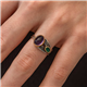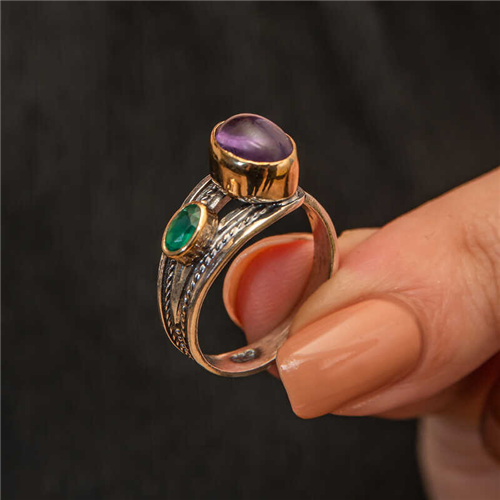 Silver Amethyst Stone Emerald Authentic Adjustable Women's Ring Amethyst provides spiritual balance by reducing stress, anxiety and negative thoughts. Emerald especially represents the feelings of love, friendship and devotion. It symbolizes deep loyalty and trust in relationships. It is a perfect option as a birthday gift, Valentine's Day gift or a gift for mothers on special occasions. The silver authentic ring is made of 925 sterling silver. Rhodium plated on the silver. Rhodium plated silver authentic ring preserves its shine for a long time and oxidation is delayed. Like all women's rings, the silver authentic women's ring is produced by hand. Due to silver and precious stones, there may be a ± 10% deviation in the average product weight. Width: 0.80 cm Length: 0.80 cm Average Weight: 4.10 gr.
