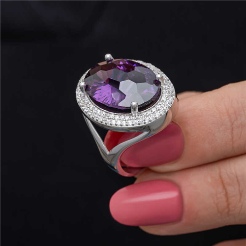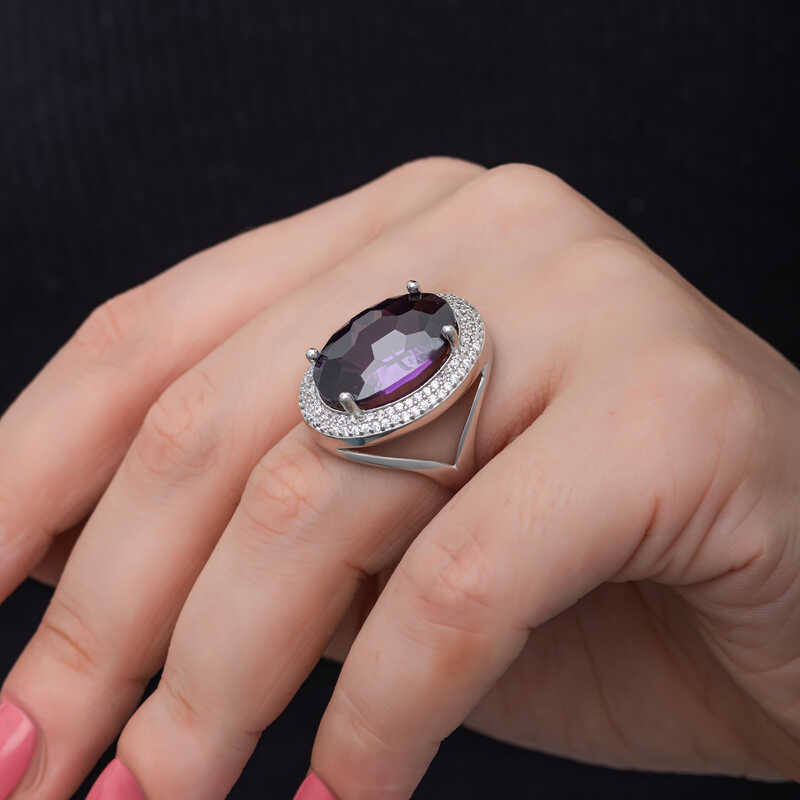 Silver Amethyst Women's RingAmethyst, used by many civilizations for centuries and retaining its value to this day, has been one of the most popular precious stones in almost every period. It has been known as "purple ruby" and "purple crystal" in various cultures, and sometimes as the "stone of love." Like all precious stones, amethyst is used in jewelry, ornaments, and carving. Dark purple amethyst, believed to provide healing and positive energy, is particularly prominent in jewelry. Not only its contact with the body but also the positive energy the stone radiates to its environment contributes to its great demand. Jewelry, which has symbolized your image for centuries, is available in specially designed collections. Reflect your style with silver ring models that accompany you at every moment, from your daily life to your special occasions. Start revealing the creative originality that speaks to your soul with these striking designs. It's now much easier to stand out with your attractive style in every environment with a variety of silver rings that will help you create your dream combinations. Amethyst stone women's ring is made of 925 sterling silver and rhodium plated. All of our silver ring models are handmade. Due to the silver and precious stones, there may be a ± 10% deviation from the average product weight.Width: 2.10 cmLength: 2.80 cmAvg. Weight: 9.40 gr.