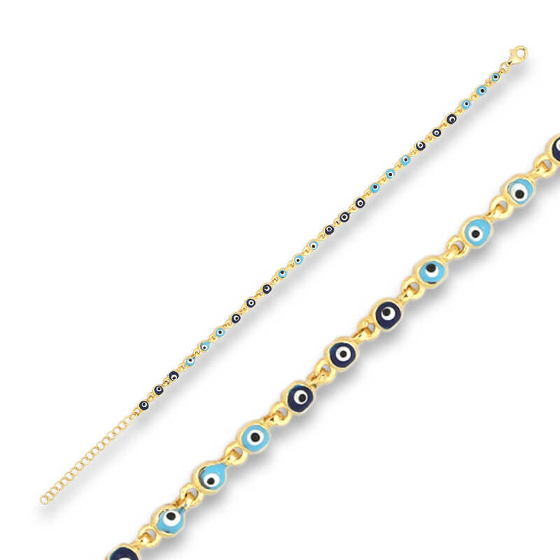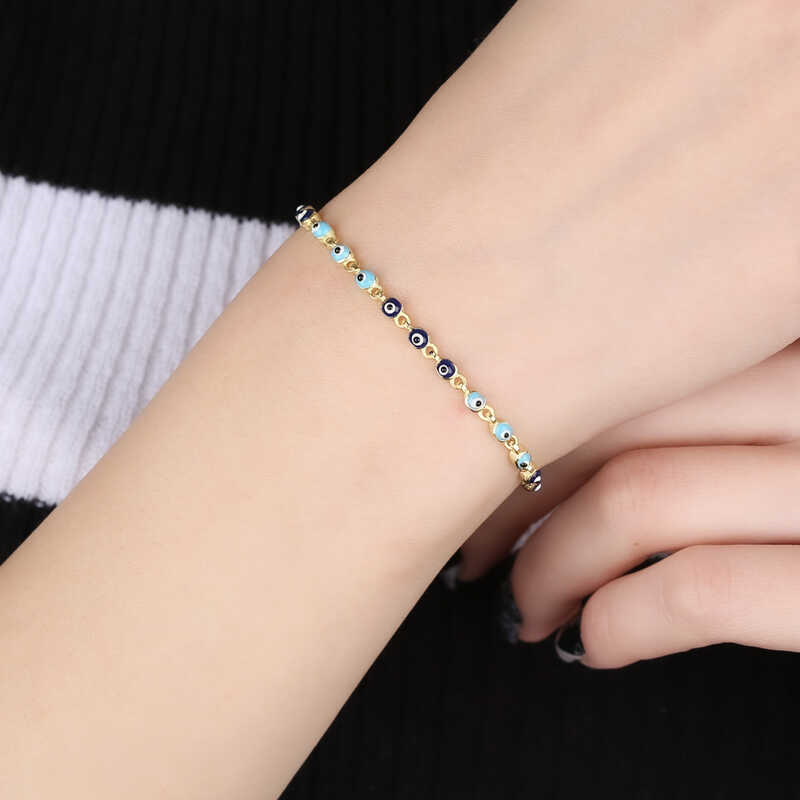 Silver Gold Evil Eye Beaded BraceletPeople have used the evil eye bead for many years to protect themselves from evil looks. It is a precaution against the negative effects of evil looks on people, the evil eye bead… For this reason, people wear the evil eye bead to protect their loved ones. This evil eye bead bracelet reflects elegance and style. You can choose this model, which has always been popular and does not compromise on its elegance, as a birthday gift, Valentine's Day gift or a gift for mothers on special occasions. The silver evil eye women's bracelet is made of 925 sterling silver. Gold plated on silver. Gold plated silver women's bracelets preserve their shine for a long time and oxidation is delayed. The stones on it are zircon. Like all silver women's bracelets, this silver evil eye bead women's bracelet model is entirely handmade. Due to silver and precious stones, there may be a ± 10% deviation in the average product weight.Width: 0.40 cmLength: 0.40 cmAverage Weight: 4.60 gr.Chain length: 20.00 cm