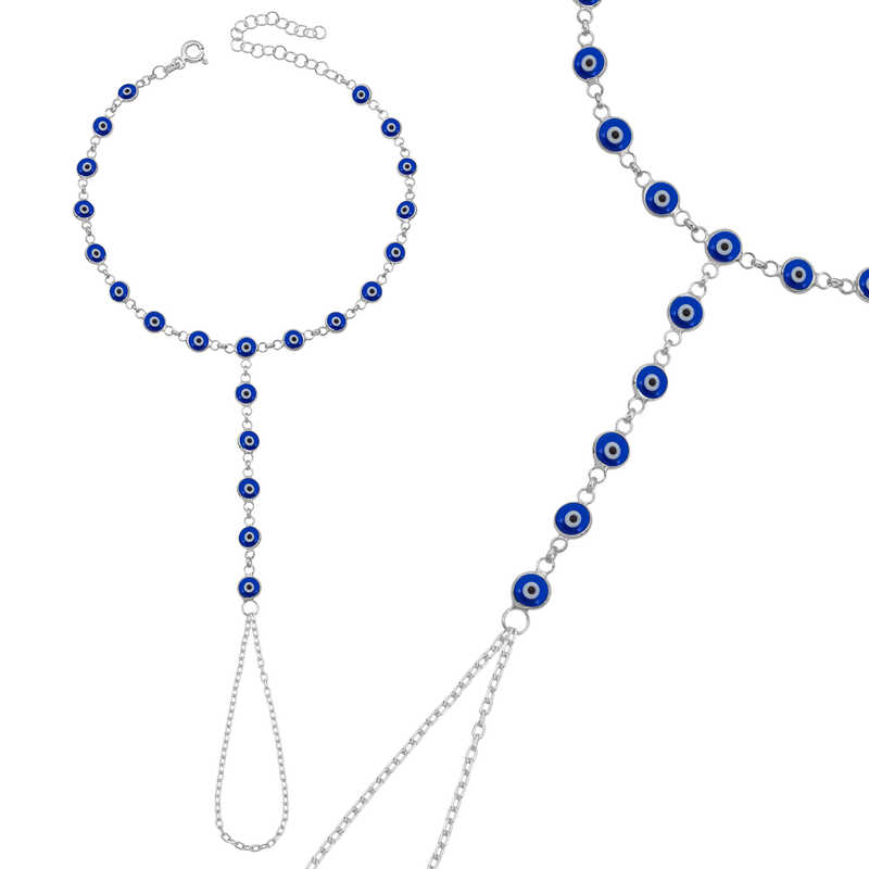 Silver Navy Blue Evil Eye Beaded Shahmaran The Silver Navy Blue Evil Eye Beaded Shahmaran Bracelet, where the traditional evil eye bead motif meets modern design, offers elegance and meaning together. The navy blue evil eye beads carefully placed in every detail provide protection against negative energies while adding a chic touch that completes your style. Thanks to its elegant chain design extending from wrist to finger, it fits perfectly with both classic and bohemian styles. It can be easily adapted to different wrist sizes with its adjustable structure. The Silver Blue evil eye beaded Shahmaran is made of 925 sterling silver. Rhodium plating on the silver ensures that it preserves its shine for a long time. All of our women's silver shahmaran models are handmade. There may be a ± 10% deviation in the average product weight due to silver and precious stones. Evil Eye Width: 0.40 mm Evil Eye Length: 0.40 mm Bracelet Length: 23.00 cm Average Weight: 3.40 gr.