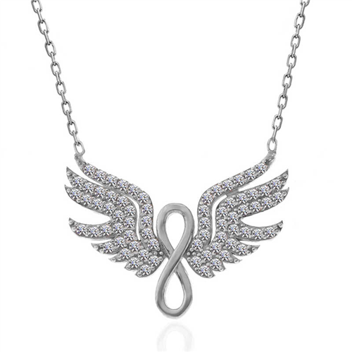 Silver Angel Wing Infinity Women's Necklace One of the most beautiful ways to express eternal commitment, eternal love, eternal trust and love that will last forever is the infinity symbol. With this special necklace that you will gift to your lover, you can express your eternal love and give the message that you will be together forever. Angel wing infinity women's necklace is made of 925 sterling silver. Rhodium plated silver. Rhodium plated silver women's necklace models preserve their shine for a long time and oxidation is delayed. The stones on the necklace are zircon. The average silver chain length is 45 cm. Like all silver women's necklace models, the silver angel wing infinity women's necklace is also handmade. Due to silver and precious stones, there may be ± 10% deviation in the specified product weight. Necklace Width: 2.20 cm Necklace Length: 1.90 cm Chain Length: 45 cm Average Weight: 2.80 gr.