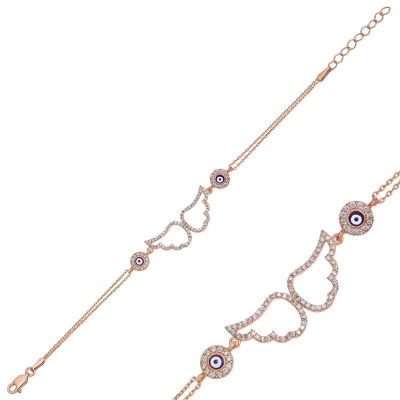 Silver Rose Angel Wing BraceletAngels are symbols of purity and cleanliness. Therefore, the angel bracelet is given to the person who is given the message that he or she is as pure and clean as an angel. You can choose this stylish bracelet as a birthday gift, Valentine's Day gift or a gift for mothers on special occasions. This special angel wing design is made of 925 sterling silver. Rose gold plated on silver. Rose gold plated silver jewelry preserves its shine for a long time, turns the silver to a pink color and oxidation is delayed. Like all women's silver bracelets, the silver angel wing women's bracelet is also produced by hand. Due to silver and precious stones, there may be ± 10% deviation in the specified product weight.Avg. Weight: 4.30 gr.