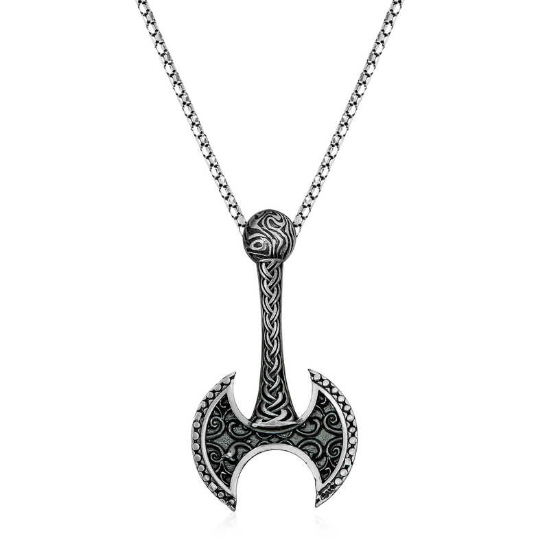 Silver Axe Necklace If you don't like to stay behind the trends, the axe necklace will be the right choice for you. The axe, one of the most important war tools inherited from our history, was designed for you with its mystical air. This stylish necklace is a perfect option for a birthday gift, Father's Day or special occasions. The necklace is made of 925 sterling silver. The silver axe model necklace has an antique pattern and oxide coating. Like other necklaces, the silver axe men's necklace is also handmade. Due to silver and precious stones, there may be ± 10% deviation in the average product weight. Width: 2.20 cm Length: 4.00 cm Avg. Weight: 10.60 gr. Chain Length: 55.00 cm.