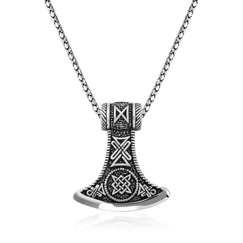 Silver Axe Men's Necklace If you don't like to stay behind the trends, the axe necklace will be the right choice for you. The axe, one of the most important war tools inherited from our history, was designed for you with its mystical air. This stylish necklace is a perfect option for a birthday gift, Father's Day or special occasions. The necklace is made of 925 sterling silver. The silver axe model necklace has an antique pattern and oxide coating. As with other necklaces, the silver axe men's necklace is also handmade. Due to silver and precious stones, there may be ± 10% deviation in the average product weight. Width: 3.20 cm Length: 3.80 cm Avg. Weight: 15.02 gr Chain Length: 55.00 cm