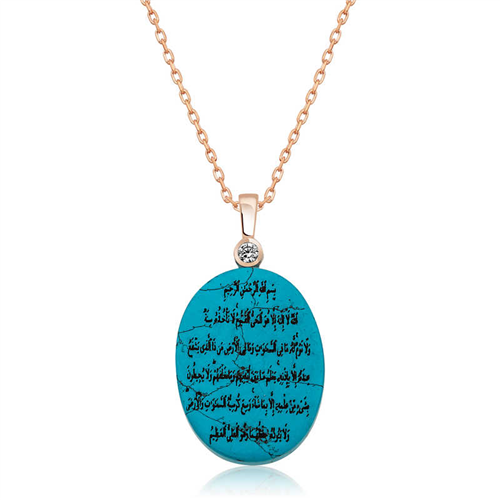 Silver Ayetel Kürsi Women's Necklace Ayetel Kürsi is the 255th verse of the Surah Al-Baqarah, which is the 2nd chapter of the Quran. In other words, Ayetel Kürsi is a verse in the Quran. It takes its name from the word “kursiyuhus samawati” (thus the word kursi) in the verse. This prayer can be recited after the Fatiha in prayer or can be recited for the purpose of glorifying Allah or supplication. The Virtue of Ayetel Kürsi; There is no god but Allah, the Ever-Living, the Self-Subsisting. Neither sleep nor slumber comes to Him. To Him belongs everything in the heavens and the earth. And who can intercede with Him except with His permission? He knows what His servants do and what they will do. (Nothing is hidden from Him.) People cannot fully know anything of His knowledge except what He has revealed. His throne encompasses the heavens and the earth, and it is not difficult for Him to protect and watch over them. He is the Exalted, the Great. The Ayetel Kursi Women's Necklace, inscribed on a turquoise stone, is made of 925 sterling silver. The silver is rose-plated. Rose-plated silver women's necklaces retain their shine for a long time and are slow to oxidize. The average silver chain length is 45 cm. Like the silver Ayetel Kürsi written women's necklace model, all silver women's necklace models are also handmade. Due to silver and precious stones, there may be a ± 10% deviation in the average product weight. Width: 1.50 cm Length: 2.00 cm Average Weight: 3.24 gr.