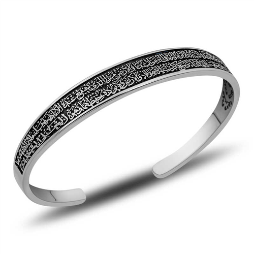 Silver Ayetel Kürsi Written Adjustable Bracelet Ayetel Kürsi is considered one of the most important verses of the Holy Quran in Islamic belief. It describes Allah's unique attributes, power, and sovereignty over the universe. Therefore, it is believed that wearing a bracelet with Ayetel Kürsi inscribed provides spiritual protection to the wearer, protecting them from evil and the evil eye. Reciting and wearing Ayetel Kürsi gives a person inner peace, confidence, and serenity. A silver bracelet is an excellent choice as a birthday gift, Valentine's Day gift, or a gift for other special occasions. The silver is oxidized. Oxidized silver bracelets preserve their shine for a long time. Due to silver and precious stones, there may be a ±10% deviation from the average product weight. Bracelet Width: 1.00 cm Bracelet Diameter: 7.00 cm Avg. Weight: 22.00 gr.