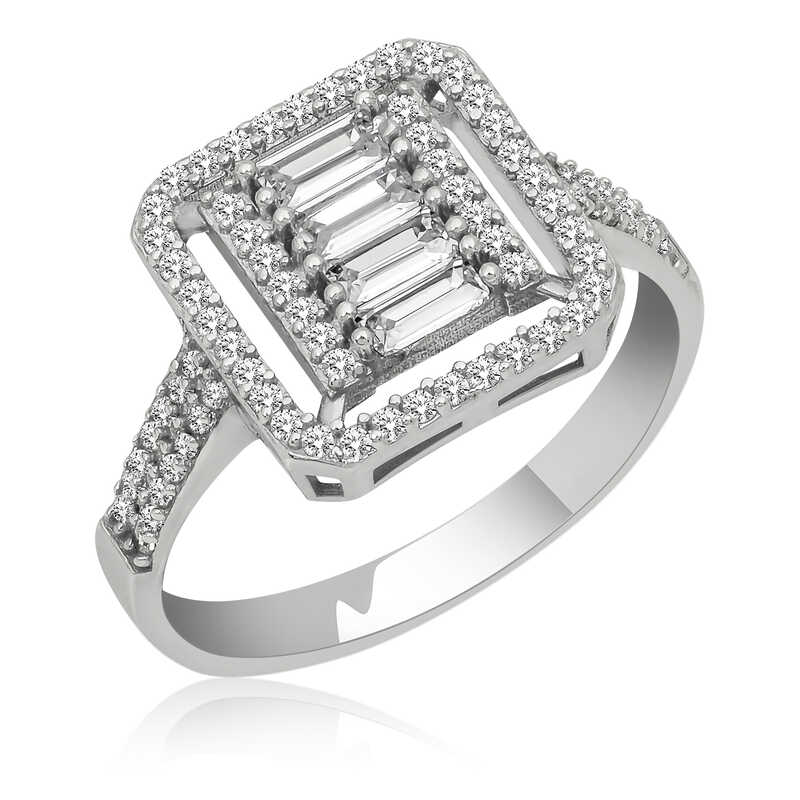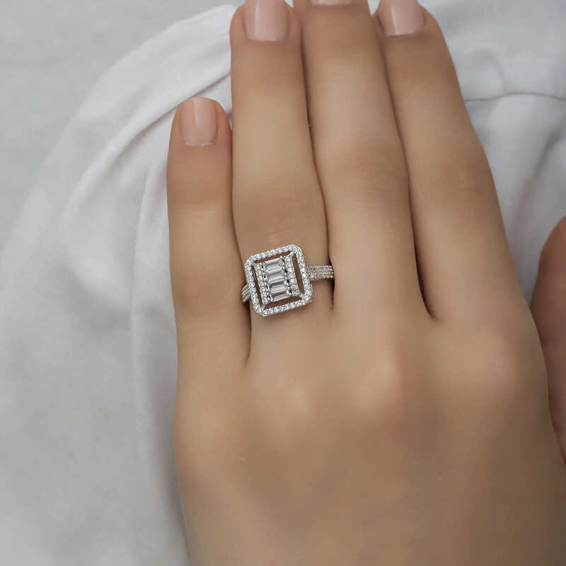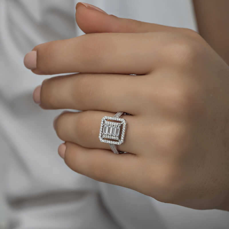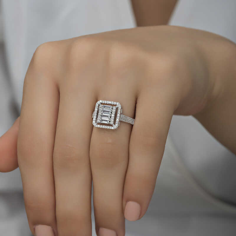 Silver Baguette Cut Women's RingThis specially designed baguette cut ring, which you can easily use in daily life, is made of 925 sterling silver. Rhodium plated silver. Rhodium plated women's silver ring models preserve their shine for a long time and oxidation is delayed. The stones on the ring are zircon. It is a perfect gift option for your loved one on birthdays, Valentine's Day and special occasions. As with all of our silver women's ring models, this baguette cut women's ring is produced entirely by hand. Due to silver and precious stones, there may be ± 10% deviation from the average product weight.Width: 2.10 cm.Length: 2.30 cm.Average Weight: 3.30 gr.