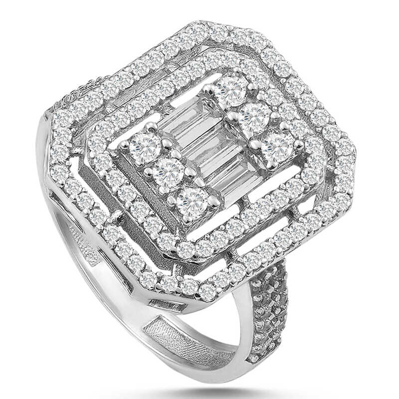 Silver Baguette Cut Women's RingThis specially designed baguette cut ring, which you can easily use in daily life, is made of 925 sterling silver. Rhodium plated silver. Rhodium plated women's silver ring models preserve their shine for a long time and oxidation is delayed. The stones on the ring are zircon. It is a perfect gift option for your loved one on birthdays, Valentine's Day and special occasions. As with all of our silver women's ring models, this baguette cut women's ring is produced entirely by hand. Due to silver and precious stones, there may be ± 10% deviation from the average product weight.Width: 2.10 cm.Length: 2.40 cm.Average Weight: 3.60 gr.