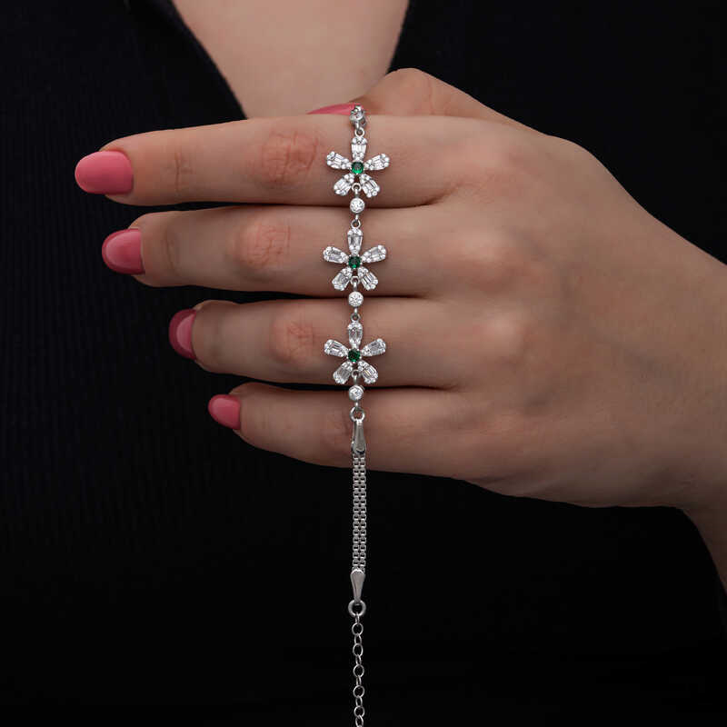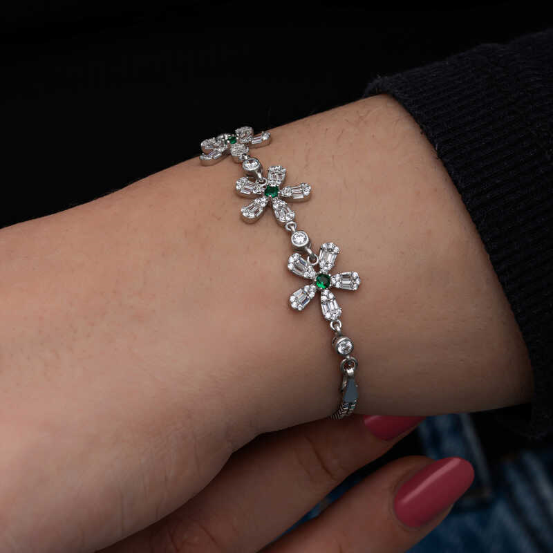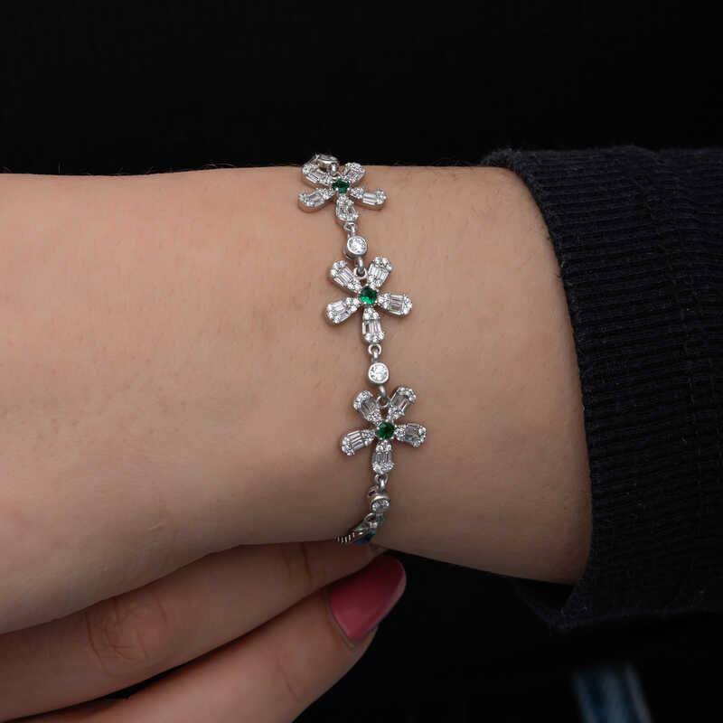 Silver Baguette Flower Patterned Women's BraceletYou can use our fashion-friendly silver baguette bracelet models in an elegant way both in your daily life and on special days and nights. You can complete your outfits with innovative products that appeal to the taste of women of all ages. With designs that each appeal to a different style, you can choose our models that suit your sporty, classic and alternative clothing styles. This stylish bracelet is a perfect option for a birthday gift, a Valentine's Day gift or on special occasions. Silver baguette stone flower patterned women's bracelet is made of 925 sterling silver. This bracelet is rhodium plated. Rhodium plated products preserve their shine for a long time and delay oxidation. Like all silver women's bracelet models, the silver baguette stone women's bracelet model is also hand-crafted. Due to silver and precious stones, there may be a ± 10% deviation in the average product weight.Bracelet Width: 1.40 cmBracelet Length: 19 cmAverage Weight: 5.90 gr.