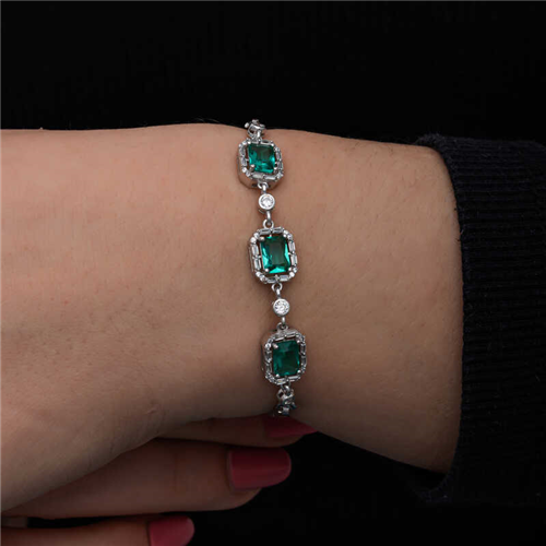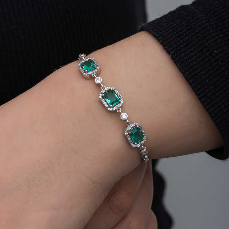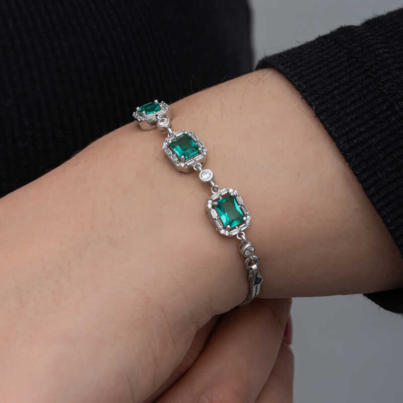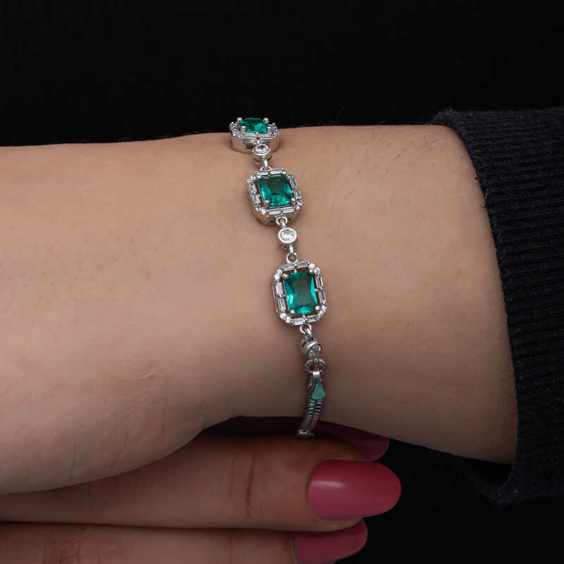 Silver Baguette Green Stone Women's BraceletYou can use our fashion-friendly silver baguette bracelet models in an elegant way both in your daily life and on special days and nights. You can complete your outfits with innovative products that appeal to the taste of women of all ages. With designs that each appeal to a different style, you can choose our models that suit your sporty, classic and alternative clothing styles. This stylish bracelet is a perfect option for a birthday gift, a Valentine's Day gift or on special occasions. Silver baguette green stone women's bracelet is made of 925 sterling silver. This bracelet is rhodium plated. Rhodium plated products preserve their shine for a long time and delay oxidation. Like all silver women's bracelet models, the silver baguette green stone women's bracelet model is also handmade. Due to silver and precious stones, there may be a ± 10% deviation in the average product weight.Baguette Width: 0.90 cmBaguette Length: 1.10 cmBracelet Length: 19.00 cmAverage Weight: 6.30 gr.