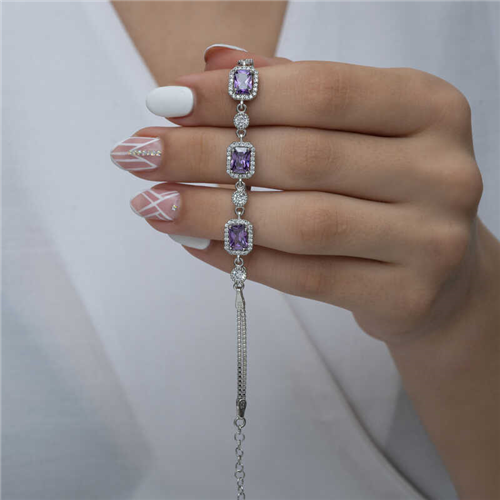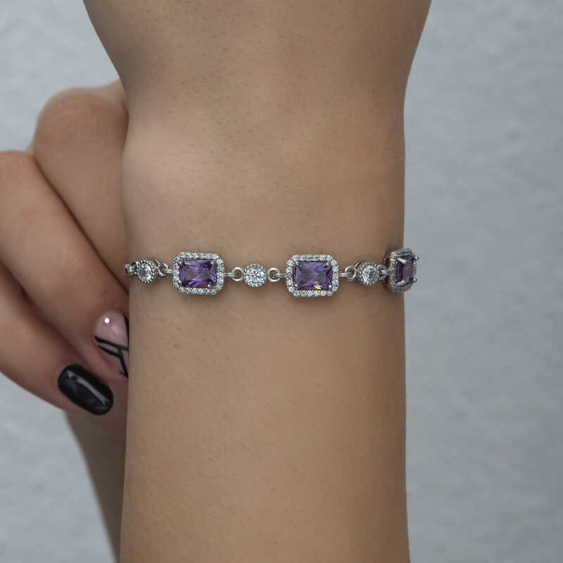 Silver Baguette Purple Stone Women's BraceletYou can use our fashion-friendly silver baguette bracelet models in an elegant way both in your daily life and on special days and nights. You can complete your outfits with innovative products that appeal to the taste of women of all ages. With designs that each appeal to a different style, you can choose our models that suit your sporty, classic and alternative clothing styles. This stylish bracelet is a perfect option for a birthday gift, a Valentine's Day gift or on special occasions. Silver baguette purple stone women's bracelet is made of 925 sterling silver. This bracelet is rhodium plated. Rhodium plated products preserve their shine for a long time and delay oxidation. Like all silver women's bracelet models, the silver baguette purple stone women's bracelet model is also handmade. Due to silver and precious stones, there may be a ± 10% deviation in the average product weight.Baguette Width: 0.80 cmBaguette Length: 1.00 cmBracelet Length: 23.00 cmAverage Weight: 7.50 gr.