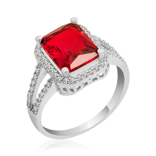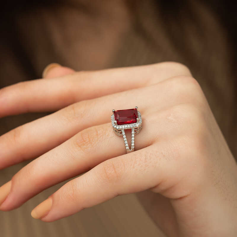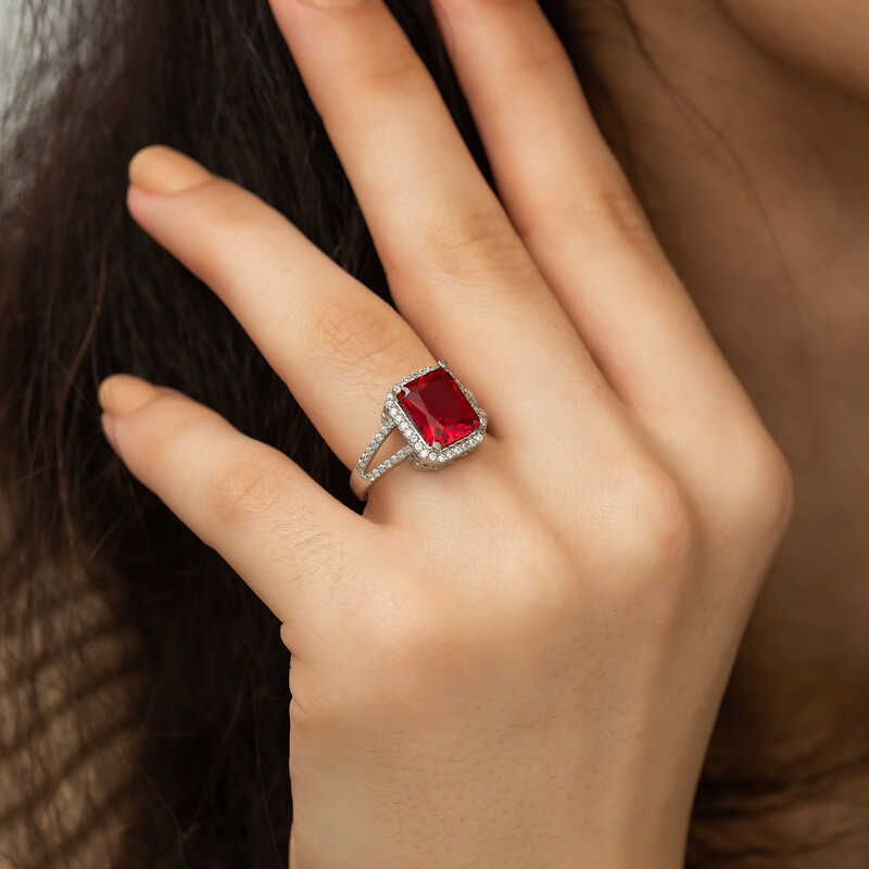Silver Red Baguette Square Women's Ring This specially designed baguette square ring, which you can use easily in daily life, is made of 925 sterling silver. Rhodium plated silver. Rhodium plated women's silver ring models preserve their shine for a long time and oxidation is delayed. The stones on the ring are zircon. It is a perfect gift option for your loved one on birthdays, Valentine's Day and special occasions. As with all of our silver women's ring models, this baguette cut women's ring is also produced entirely by hand. Due to silver and precious stones, there may be ± 10% deviation from the average product weight. Width: 2.00 cm. Length: 2.40 cm. Avg. Weight: 3.50 gr.
