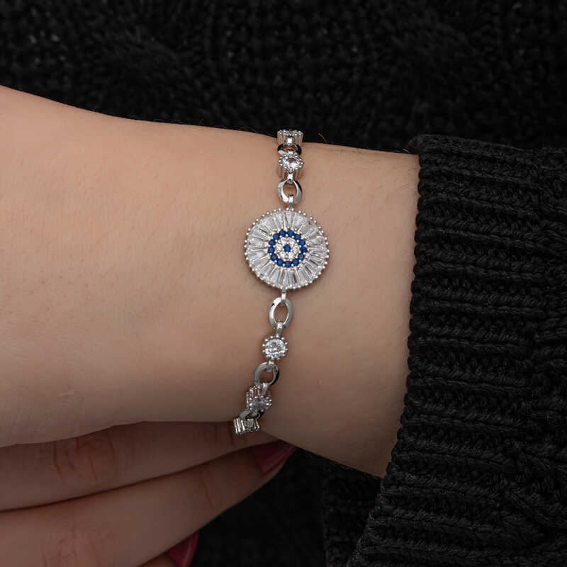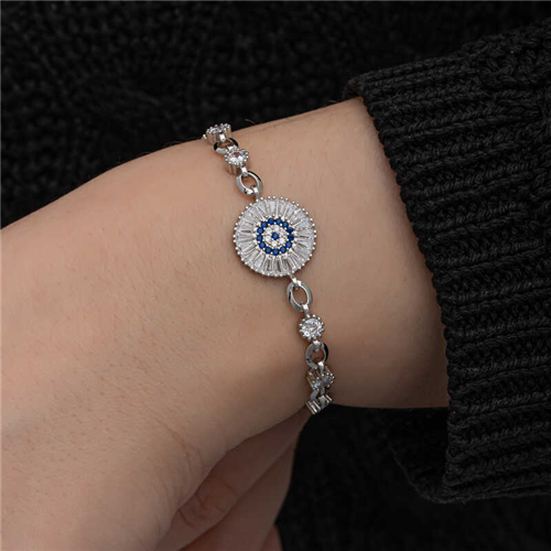 ​Silver Baguette Stone Evil Eye Women's BraceletYou can use our fashion-friendly silver baguette bracelet models in an elegant way both in your daily life and on special days and nights. You can complete your outfits with innovative products that appeal to the taste of women of all ages. With designs that each appeal to a different style, you can choose our models that suit your sporty, classic and alternative clothing styles. This stylish bracelet is a perfect option for a birthday gift, a Valentine's Day gift or on special occasions. The silver baguette stone evil eye women's bracelet is made of 925 sterling silver. This bracelet is rhodium plated. Rhodium plated products preserve their shine for a long time and delay oxidation. Like all silver women's bracelet models, the silver baguette stone women's bracelet model is also handmade. Due to silver and precious stones, there may be a ± 10% deviation in the average product weight.Evil Eye Bracelet Diameter: 1.50 cmAverage Length: 21.00 cmAverage Weight: 6.50 gr.