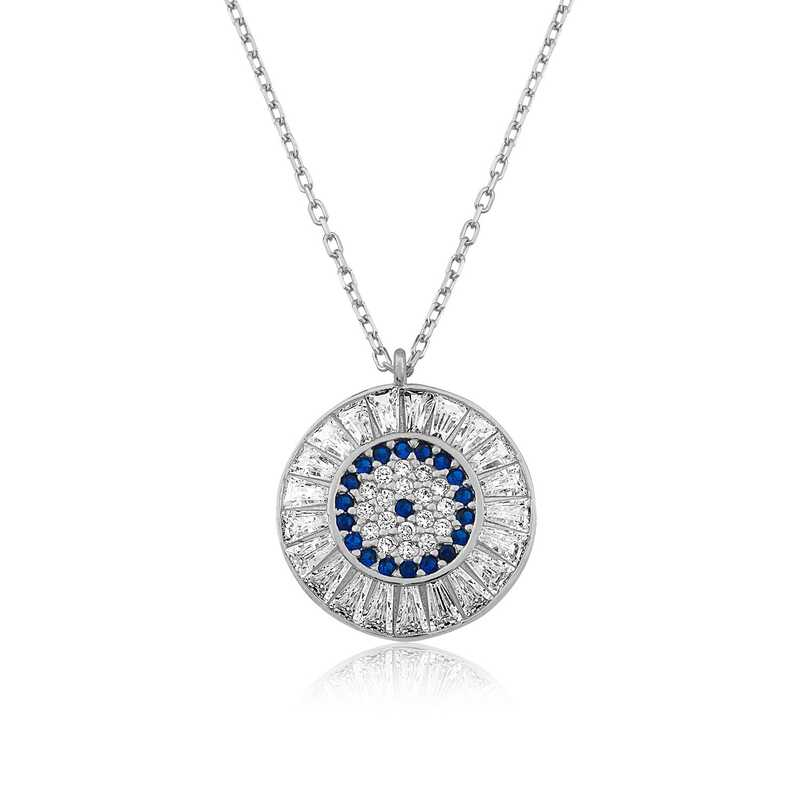 Silver Baguette Stone Evil Eye Women's Necklace People have used the evil eye bead for many years to protect themselves from evil gazes. The evil eye bead is a precaution against the negative effects of evil gazes on people. For this reason, people wear the evil eye bead to protect their loved ones. This evil eye necklace reflects elegance and style. You can choose this model, which has always been popular and does not compromise on its elegance, as a birthday gift, Valentine's Day gift or a gift for mothers on special occasions. The silver evil eye women's necklace is made of 925 sterling silver. Rhodium plated silver. Rhodium plated silver women's necklaces preserve their shine for a long time and oxidation is delayed. The stones on it are baguettes and zirconias. Like all silver women's necklace models, this silver baguette stone evil eye women's necklace model is entirely handmade. Due to silver and precious stones, there may be a ± 10% deviation in the average product weight. Width: 1.50 cm Length: 1.50 cm Average Weight: 2.51 gr. Chain Length: 45.00 cm