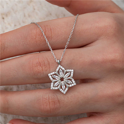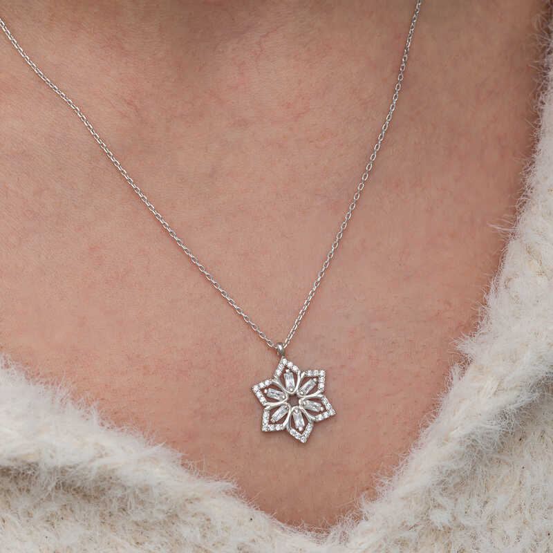 Silver Baguette Stone Flower Women's Necklace Flowers often represent love and romance. For this reason, flower necklaces are frequently used as a loving gift option. This stylish necklace is a perfect option for a birthday gift, Valentine's Day or special occasions. The necklace is made of 925 sterling silver. Rhodium plated on the silver. Due to silver and precious stones, there may be ± 10% deviation from the average product weight. Width: 1.50 cm Length: 2.00 cm Avg. Weight: 2.60 gr. Chain Length: 45.00 cm