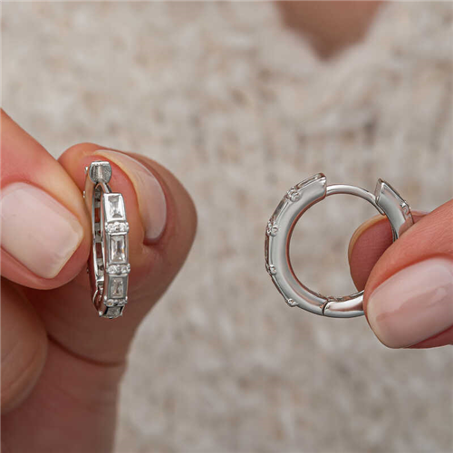 Silver Baguette Stone Hoop Women's Earrings You can use these stylish and sporty hoop earrings very easily in daily life. Silver baguette stone hoop women's earrings are a perfect option for a birthday gift, a Valentine's Day gift or a gift for mothers on special occasions. Silver hoop women's earrings are made of 925 sterling silver. Rhodium plated silver. Rhodium plated silver hoop women's earrings preserve their shine for a long time and oxidation is delayed. As with all women's earrings, silver hoop women's earrings are handmade. Due to silver and precious stones, there may be ± 10% deviation in the average product weight. Width: 0.30 cm Earring Diameter: 2.00 cm Avg. Weight: 4.70 gr.