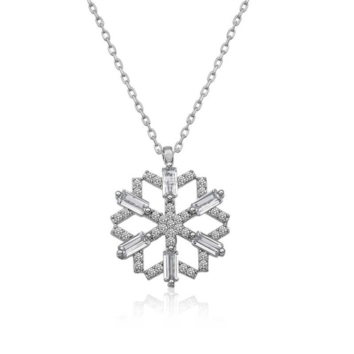 Silver Baguette Stone Snowflake Necklace When snow falls, every snowflake that falls to the ground is different from each other. In other words, each snowflake is unique. If you think that your loved one is unique in the world, this snowflake women's necklace will be a very meaningful gift. Baguette stone snowflake women's necklace model is made of 925 sterling silver. Rhodium plated silver. Rhodium plated silver women's necklace models preserve their shine for a long time and oxidation is delayed. The white stones on the necklace are zircon and baguette. The average silver chain length is 45 cm. The silver snowflake women's necklace model is handmade like other silver women's necklace models. Due to silver and precious stones, there may be a ± 10% deviation in the specified product weight. Width: 1.70 cm Length: 1.70 cm Average Weight: 2.60 gr.