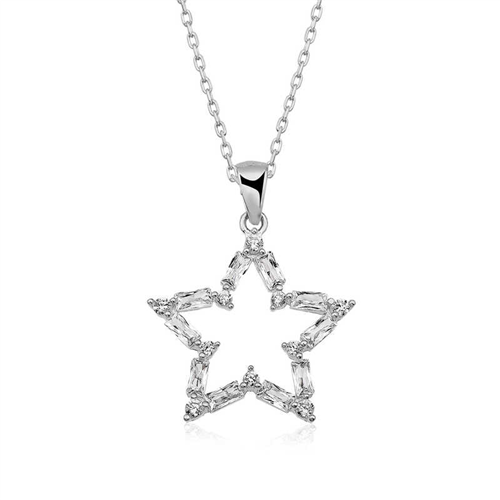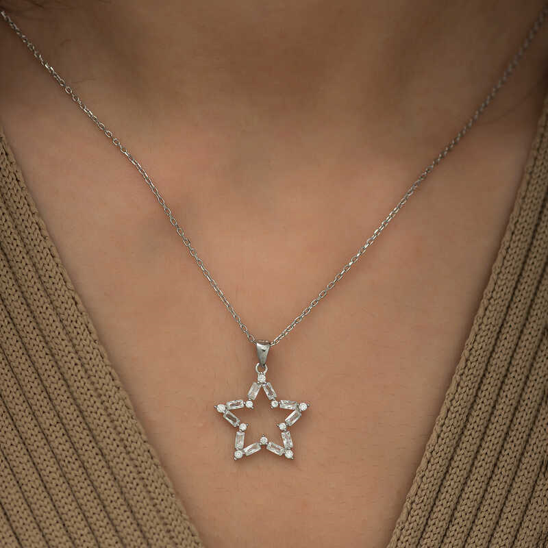Silver Baguette Stone Star Necklace The star is an auspicious symbol believed to bring luck in many societies and teachings. It carries the energy of the Planet Venus. The Planet Venus is also the representative of the energy of love and romance. This stylish star necklace made of baguette stones is a perfect option for a birthday gift, Valentine's Day gift or on special occasions. Silver baguette stone star women's necklace is made of 925 sterling silver. This necklace is rhodium plated. Rhodium plated silver women's necklace models preserve their shine for a long time. As with all our silver women's necklace models, the silver baguette stone star women's necklace model is handmade. Due to silver and precious stones, there may be a ± 10% deviation in the average product weight. Width: 1.70 cm Length: 1.70 cm Average Weight: 2.10 gr. Chain Length: 45.00 cm