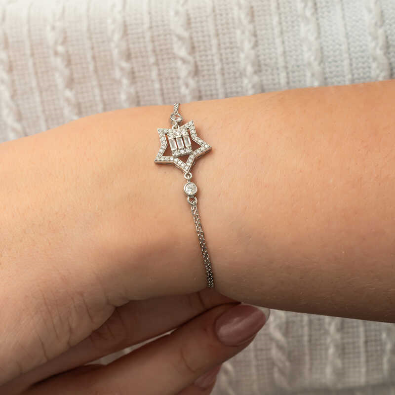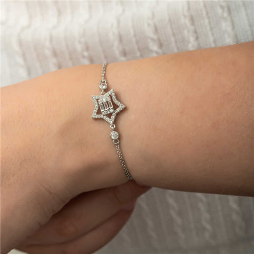 Silver Baguette Stone Star Women's Bracelet The star, reminiscent of the bright shine of the night, symbolically represents the infinity of the universe, a point in the distance. It is the symbol of shine, light, illumination and hope. Every person is special, every loved one is unique. How about making your loved ones happy with the silver star women's bracelet, the symbol of unique love and lifelong togetherness. Rhodium plated silver. Rhodium plated products preserve their shine for a long time and delay oxidation. The white stones on it are baguettes and zirconias. Like all silver women's bracelets, the silver star women's bracelet is also handmade. Due to silver and precious stones, there may be a ± 10% deviation in the average product weight. Width: 1.50 cm Height: 2.50 cm Bracelet length: 20 cm Average Weight: 2.50 gr.