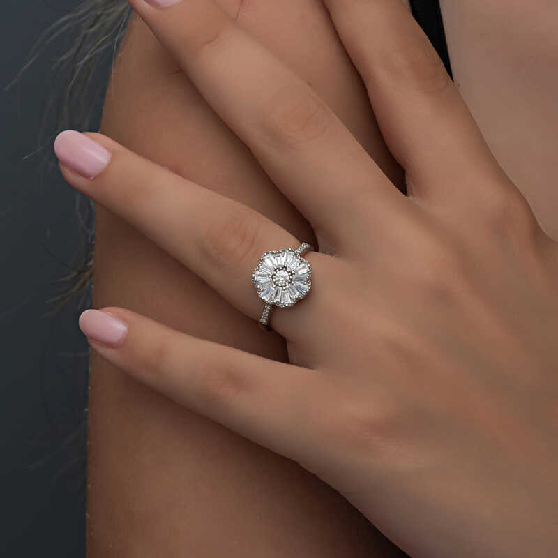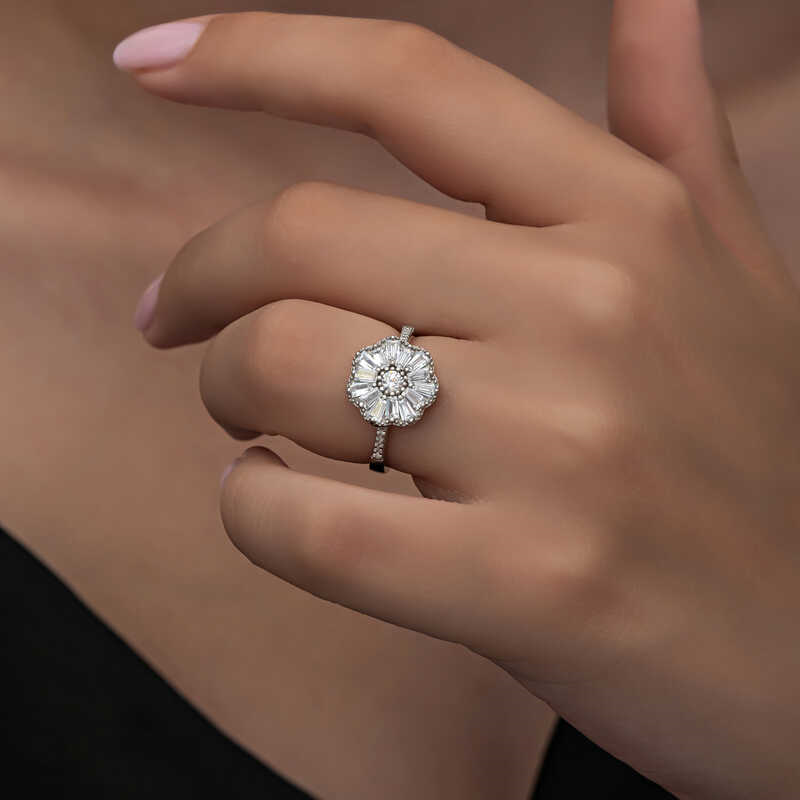 Silver Baguette Stone Women's RingThis stylish ring model adorned with sparkling baguette stones is a very stylish option that you can choose as a birthday gift, Valentine's Day gift or a gift for mothers on special occasions. Baguette stone women's ring is made of 925 sterling silver. Rhodium plated silver. Rhodium plated silver rings preserve their shine for a long time and oxidation is delayed. The stones on it are baguette and zircon. As with all women's silver rings, the silver baguette stone women's ring model is produced by handmade. Due to silver and precious stones, there may be ± 10% deviation in the average product weight.Width: 2.20 cmLength: 2.40 cmAvg. Weight: 2.70 gr.