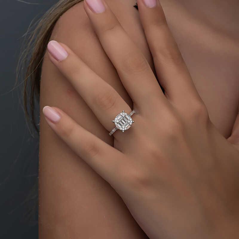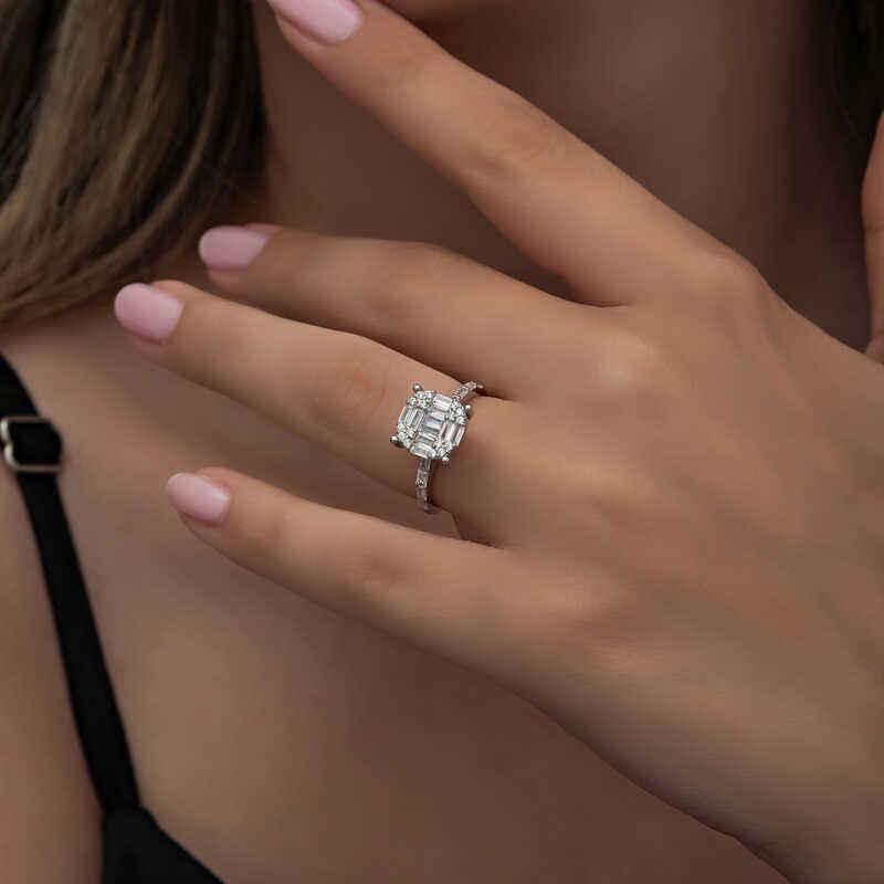 Gümüş Baget Taşlı Kadın YüzükIşıl ışıl baget taşlarla süslenmiş bu şık yüzük modeli; doğum günü hediyesi, sevgililer günü hediyesi veya annelere hediye olarak özel günlerde tercih edebileceğiniz çok şık bir seçenektir. Baget taşlı kadın yüzük 925 ayar gümüşten imal edilmiştir. Gümüş üzerine rodyum kaplama yapılmıştır. Rodyum kaplama yapılan gümüş yüzükler parlaklığını uzun süre muhafaza eder, oksitlenmesi gecikir. Üzerinde bulunan taşlar baget ve zirkondur. Tüm kadın gümüş yüzüklerde olduğu gibi gümüş baget taşlı kadın yüzük modeli de el emeği ile üretilmiştir. Gümüş ve değerli taşlar nedeniyle belirtilen ortalama ürün ağırlığında ± %10 sapma olabilmektedir.En : 2.00 cmBoy : 2.60 cmOrt. Ağırlık : 3.30 gr.