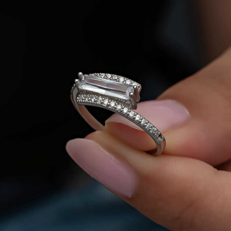 Silver Baguette Stone Women's RingThis stylish ring model adorned with sparkling baguette stones is a very stylish option that you can choose on special occasions as a birthday gift, Valentine's Day gift or a gift for mothers. Baguette stone women's ring is made of 925 sterling silver. Rhodium plated silver. Rhodium-plated silver rings preserve their shine for a long time and oxidation is delayed. The stones on it are baguette and zircon. As with all women's silver rings, the silver baguette stone women's ring model is handmade. Due to silver and precious stones, there may be ± 10% deviation in the average product weight.Width: 2.00 cmLength: 2.10 cmAvg. Weight: 1.90 gr.