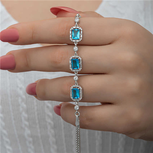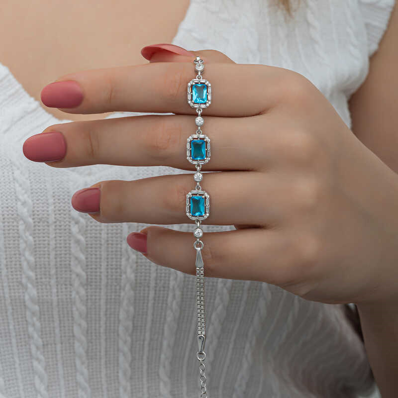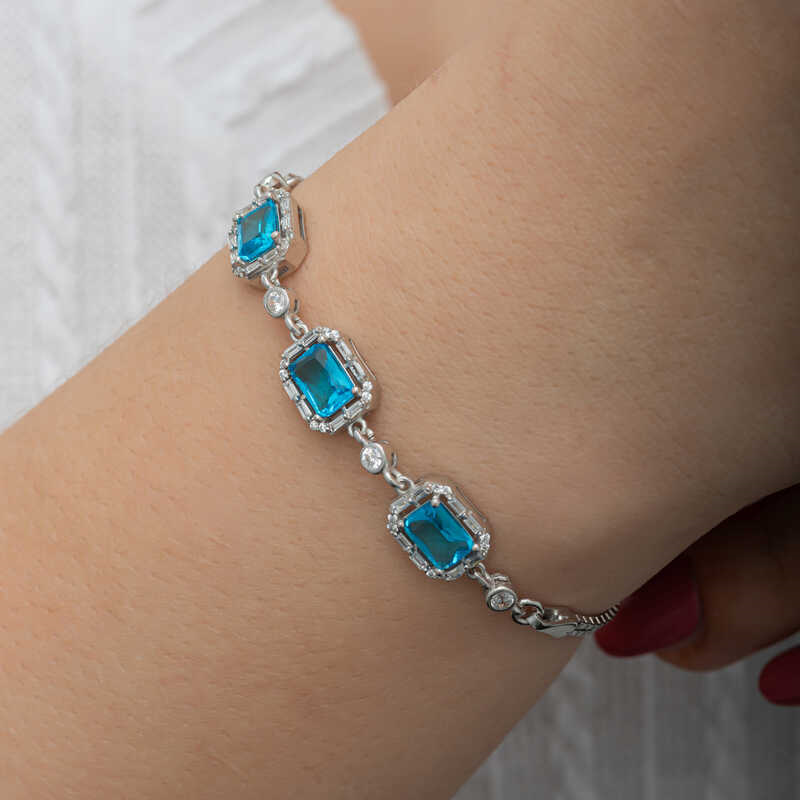 Silver Baguette Turquoise Stone Women's BraceletYou can use our fashion-friendly silver baguette bracelet models in an elegant way both in your daily life and on special days and nights. You can complete your outfits with innovative products that appeal to the taste of women of all ages. With designs that each appeal to a different style, you can choose our models that suit your sporty, classic and alternative clothing styles. This stylish bracelet is a perfect option for a birthday gift, a Valentine's Day gift or on special occasions. Silver baguette turquoise stone women's bracelet is made of 925 sterling silver. This bracelet is rhodium plated. Rhodium plated products preserve their shine for a long time and delay oxidation. Like all silver women's bracelet models, the silver baguette turquoise stone women's bracelet model is also handmade. Due to silver and precious stones, there may be a ± 10% deviation in the average product weight.Baguette Width: 0.80 cmBaguette Length: 1.00 cmBracelet Length: 18.00 cmAverage Weight: 6.50 gr.