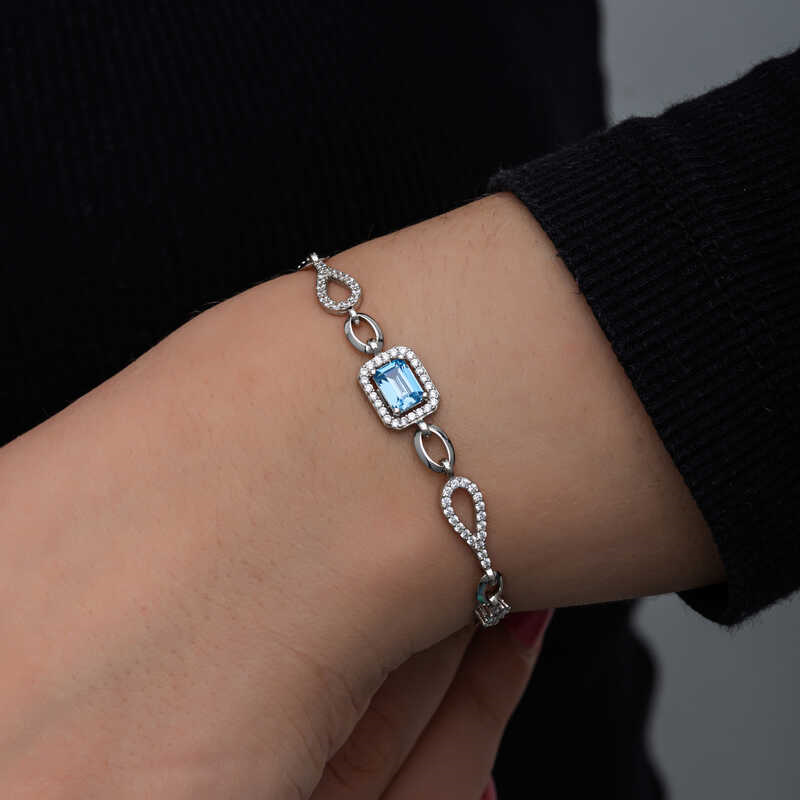 Silver Baguette Turquoise Stone Women's Bracelet You can use our fashion-friendly silver baguette bracelet models in an elegant way both in your daily life and on special days and nights. You can complete your outfits with innovative products that appeal to the taste of women of all ages. With designs that each appeal to a different style, you can choose our models that suit your sporty, classic and alternative clothing styles. This stylish bracelet is a perfect option for a birthday gift, a Valentine's Day gift or on special occasions. Silver baguette turquoise stone women's bracelet is made of 925 sterling silver. This bracelet is rhodium plated. Rhodium plated products preserve their shine for a long time and delay oxidation. Like all silver women's bracelet models, the silver baguette turquoise stone women's bracelet model is also handmade. Due to silver and precious stones, there may be a ± 10% deviation in the average product weight. Baguette Width: 0.90 cm Baguette Length: 1.10 cm Bracelet Length: 20.00 cm Average Weight: 5.30 gr.