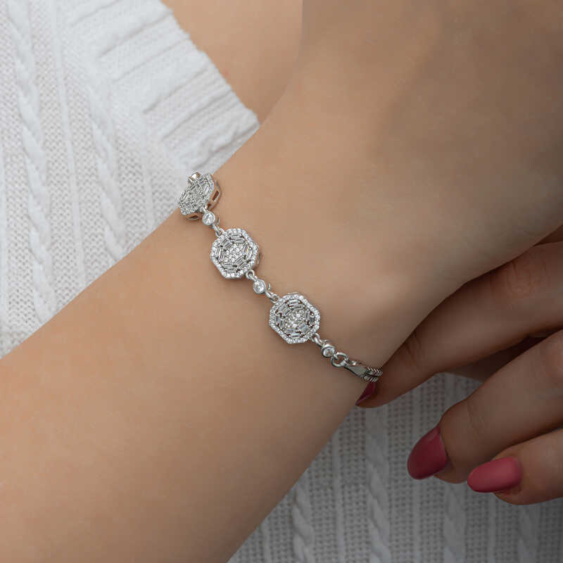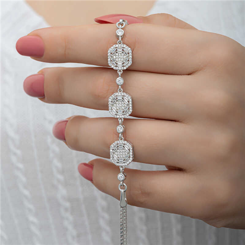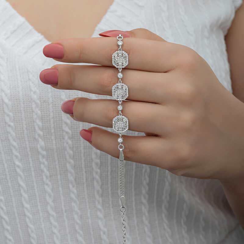 ​Silver Baguette Women's BraceletYou can use our fashion-friendly silver baguette bracelet models in an elegant way both in your daily life and on special days and nights. You can complete your outfits with innovative products that appeal to the taste of women of all ages. With designs that each appeal to a different style, you can choose our models that suit your sporty, classic and alternative clothing styles. This stylish bracelet is a perfect option for a birthday gift, a Valentine's Day gift or for special occasions. Silver baguette stone women's bracelet is made of 925 sterling silver. This bracelet is rhodium plated. Rhodium plated products preserve their shine for a long time and delay oxidation. Like all silver women's bracelet models, the silver baguette stone women's bracelet model is also handmade. Due to silver and precious stones, there may be a ± 10% deviation in the average product weight.Baguette Width: 1.00 cmBaguette Length: 1.00 cmBracelet Length: 19 cmAverage Weight: 6.50 gr.