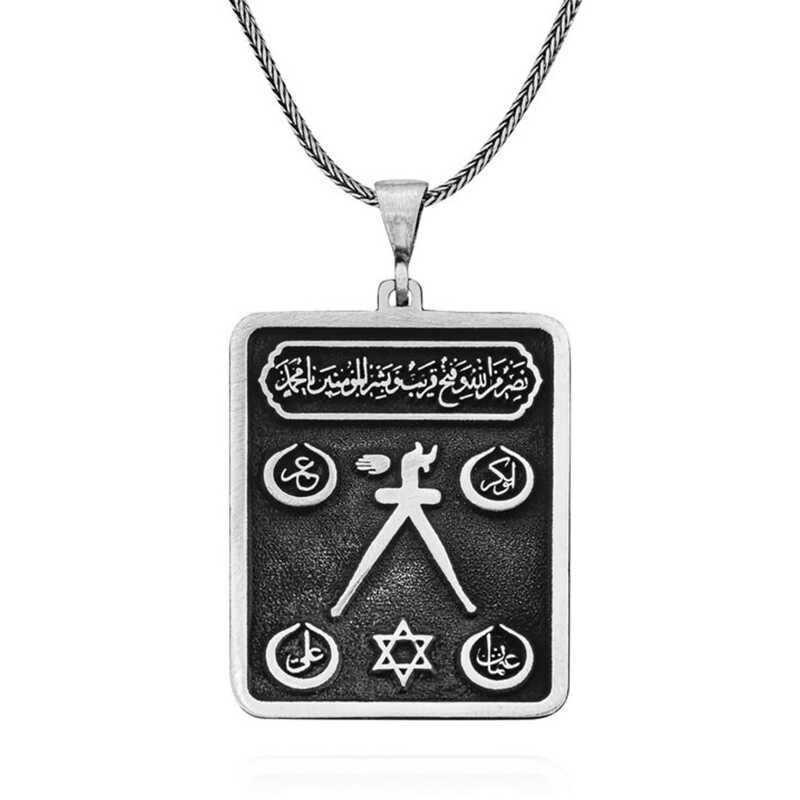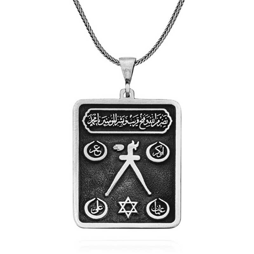Silver Barbaros Hayrettin Pasha Flag Embroidered Necklace On the Barbaros flag; At the bottom, there is a zulfikar in the belly and in the four corners of it, there are crescent shapes that represent Islam and the names of Abu Bakr, Omar, Osman and Ali are written on the top right, top left, bottom right and bottom left respectively. The white hand near the hilt of the sword is the "claw-i ali aba". This stylish necklace is made of 925 sterling silver. Oxidized silver is coated. Necklaces with oxidized coating have an authentic look. Like all necklaces, the silver Barbaros Hayrettin Pasha flag embroidered necklace is also handmade. The average silver chain length is 55 cm. Due to silver and precious stones, there may be a ± 10% deviation in the average product weight. Width: 2.20 cm Length: 4.50 cm Average Weight: 15.10 gr. Chain length: 55 cm