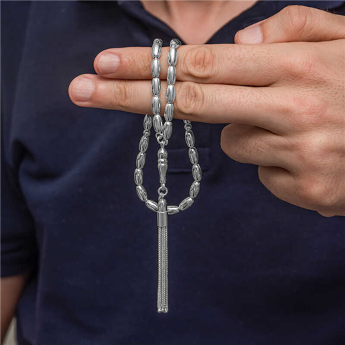 Silver Barley Cut Men's Prayer Beads Specially designed for men, this Silver Barley Cut Prayer Beads attracts attention with its elegant and stylish stance. Each bead of the prayer bead is made of 925 sterling silver, and its barley cut form adds a modern touch to classic prayer beads models. The barley cut beads provide both an aesthetic appearance and easy fingering. The tasseled design adds an authentic touch to the prayer bead, making it an ideal choice for both daily use and as a gift alternative. You can enjoy using this silver prayer bead; you can choose it as a gift for birthdays, Valentine's Day, Father's Day or special occasions. All of our products are handmade. Due to silver and precious stones, there may be a ± 10% deviation in the average product weight. Width: 0.40 mm Height: 1.00 cm Prayer Length: 25.00 cm Average Weight: 19.00 Gr