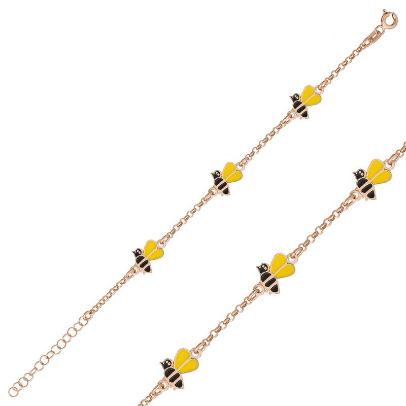 Silver Rose Bee Figured Children's Bracelet Our silver model is designed for our children and their colorful world. It is a very beautiful silver children's bracelet model that can be preferred on special occasions such as birthdays of our children and that will make them happy. Bee figured children's bracelet is made of 925 sterling silver. Rose plated silver bracelet. Rose plated silver children's bracelets preserve their shine for a long time, turns the silver to a pink color and oxidation is delayed. Like all silver children's bracelets, the silver bee figured children's bracelet is entirely handmade. Due to silver and precious stones, there may be a ± 10% deviation in the average product weight. Width: 1.00 cm Length: 1.00 cm Weight: 2.60 gr