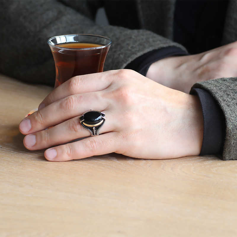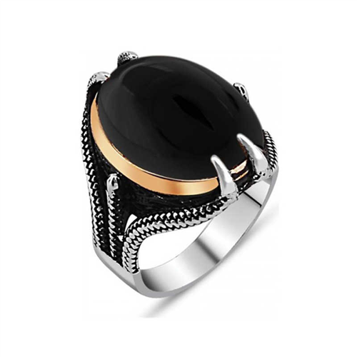 Silver Black Stone Eagle Claw Men's RingThe eagle, the king of birds and descending to earth to fight, is known for being especially warlike and powerful; that is why it has become the symbol of many nations. Inspired by this deep meaning, you can gift the eagle claw men's ring model to yourself or your loved ones on your birthday, Father's Day or special occasions. This stylish men's ring model is made of 925 sterling silver. Oxidized silver is coated. Oxidized men's rings preserve their shine for a long time. Like all men's ring models, the silver black stone eagle claw men's ring model is also produced by hand. Due to silver and precious stones, there may be a ± 10% deviation from the stated average product weight.Average Weight: 15.00 gr.