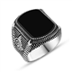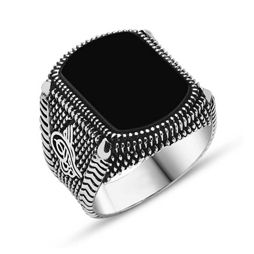 Silver Black Stone Monogram RingTuğra means the signature of the Ottoman sultans. Each tughra expresses the name, existence, and reign of the sultan to whom it belongs. The tughra symbol has survived to the present day in many forms, different for each sultan. The tughra has been preserved in every period of the Ottoman Empire and has never lost its importance. And over time, it has an important place in our art of calligraphy, and is kept alive artistically by calligraphers today. You can enjoy using the silver ring that reflects this art and gift it to your loved ones. The tughra men's ring model is made of 925 sterling silver. The tughra ring is oxidized on the silver. The black tahonyx on the ring. Like all silver men's rings, the tughra men's ring model with black stones in silver is produced entirely by hand. Due to silver and precious stones, there may be ± 10% deviation from the average product weight.Avg. Weight: 15.00 gr.