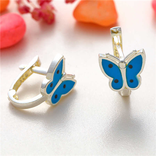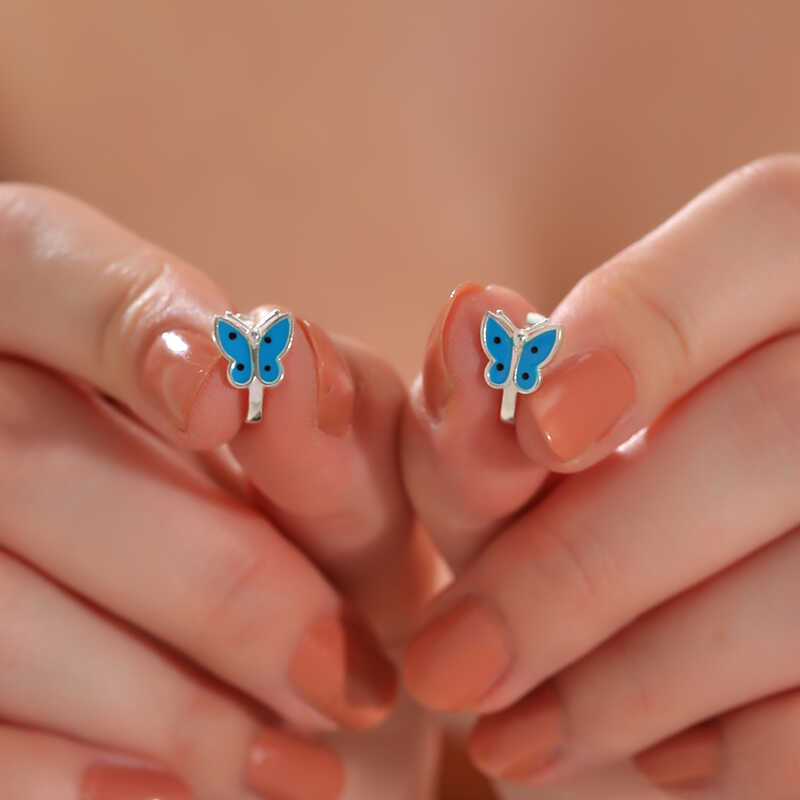 Silver Blue Butterfly Earrings for ChildrenOne of the most powerful meanings of the butterfly is its symbolism of change. In ancient Greece, it symbolized the soul's influence on the body and the profound changes this influence creates. In ancient wisdom, the butterfly is a direct symbol of the soul, symbolizing its freedom, lightness, and grace. It is one of the most popular motifs preferred by women. It reminds lovers of the mystery of nature and the richness of human imagination. In Japan, it represents the beginning of life for young girls. You can make your daughters happy by gifting them this meaningful children's earring. All of our products are handmade and due to precious stones, there may be a ± 10% deviation in product weight.Width: 0.90 cm Length: 1.00 cm Weight: 1.60 gr.