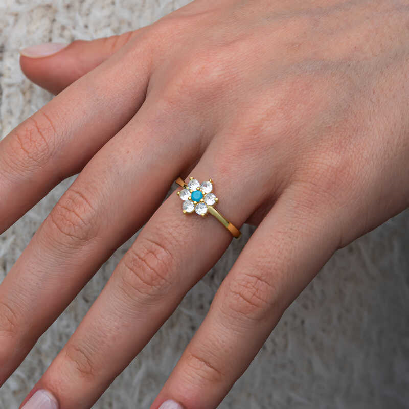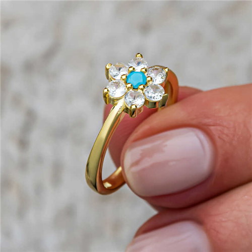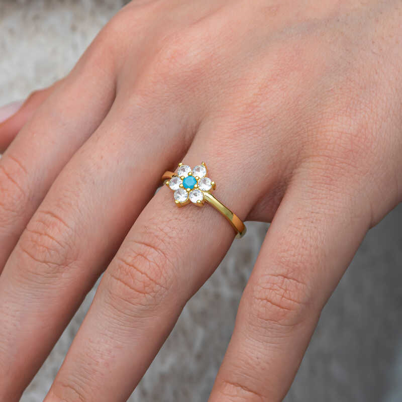 Silver Blue Stone Gold Flower Women's Ring Flower rings generally symbolize love, friendship, nature and beauty. Flowers, which are among the gifts to be given on special occasions, have been designed with a different interpretation this time. A flower ring is waiting for those who want to express their love once again, who want to say "you are a flower." This stylish ring is a perfect option for a birthday gift, Mother's Day, Valentine's Day or special occasions. Silver blue stone gold flower women's ring is made of 925 sterling silver. Gold plated silver. Gold plated silver women's ring models preserve their shine for a long time and oxidation is delayed. The stone on the earring is zircon. Like all women's silver earring models, the silver blue stone flower women's ring is also handmade. Due to silver and precious stones, there may be a ± 10% deviation in the specified product weight. Width: 1.00 mm Length: 1.10 cm Avg. Weight: 2.20 gr.
