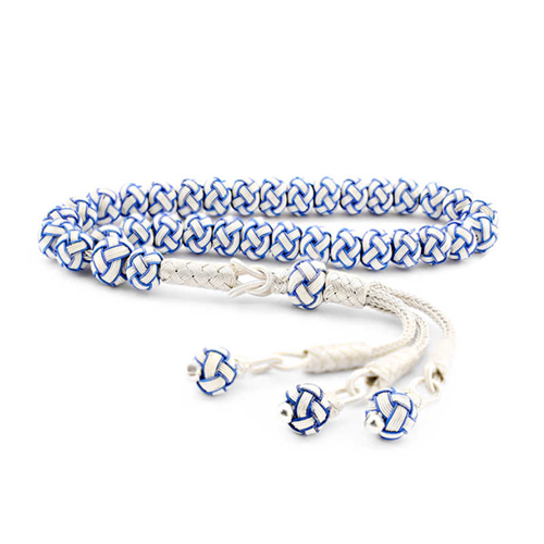 Silver Blue White Kazaziye Prayer Beads The completely handcrafted and very valuable Kazaziye prayer beads model is made of 925 sterling silver. Silver plating is done on silver. Silver-plated Silver Kazaziye prayer beads models preserve their shine for a long time and oxidation is delayed. The silver blue white Kazaziye prayer beads model is a perfect option for a birthday gift, a Valentine's Day gift or on special occasions. Due to silver and precious stones, there may be ± 10% deviation from the average product weight. Width: 0.80 cm Length: 20.50 cm Avg. Weight: 27.00 gr.