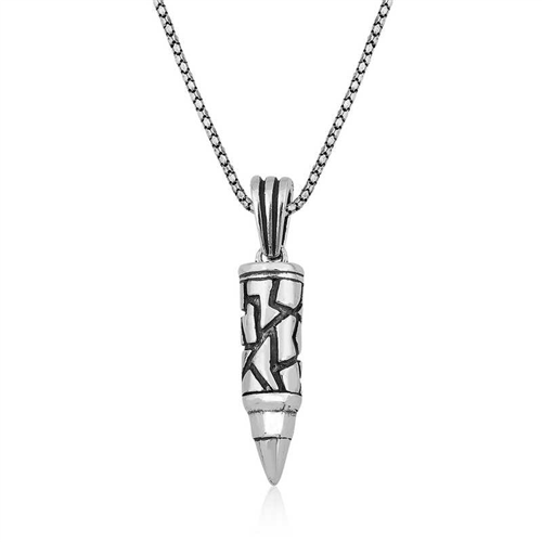 Silver Bullet Men's Necklace If you don't like to stay behind the trends, the Bullet Necklace will be the right choice for you. The bullet, one of the most important war tools left over from our history, was designed for you with its mystical air. This stylish necklace is a perfect option for a birthday gift, Father's Day or special occasions. The necklace is made of 925 sterling silver. It has an antique silver pattern and oxide coating. Like other necklaces, the silver bullet men's necklace is also handmade. Due to silver and precious stones, there may be ± 10% deviation in the average product weight. Width: 0.80 cm Length: 4.00 cm Avg. Weight: 11.25 gr. Average Chain Length: 55 cm