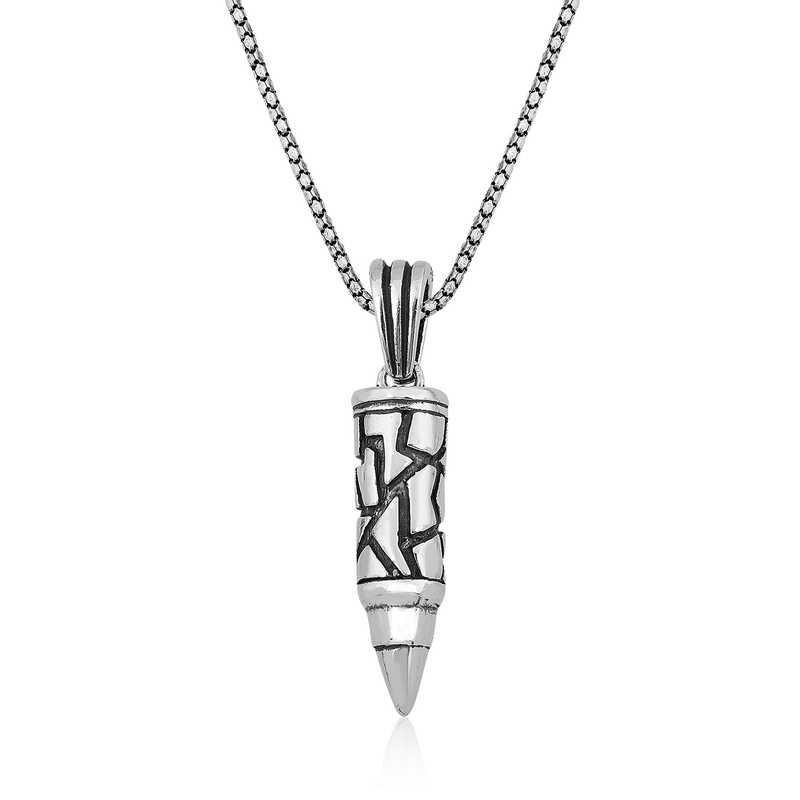 Silver Bullet Men's Necklace If you don't like to stay behind the trends, the Bullet Necklace will be the right choice for you. The bullet, one of the most important war tools left over from our history, was designed for you with its mystical air. This stylish necklace is a perfect option for a birthday gift, Father's Day or special occasions. The necklace is made of 925 sterling silver. It has an antique silver pattern and oxide coating. Like other necklaces, the silver bullet men's necklace is also handmade. Due to silver and precious stones, there may be ± 10% deviation in the average product weight. Width: 0.80 cm Length: 4.00 cm Avg. Weight: 11.25 gr. Average Chain Length: 55 cm
