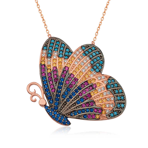 Silver Colored Butterfly Women's Necklace Butterflies, which symbolize freedom, innocence and purity, are the expression of pure affection and love. The colorful butterfly women's necklace that you and your loved ones will wear with pleasure will be one of the most beautiful gifts. The necklace is made of 925 sterling silver. Rose gold plated on silver. Rose gold plated silver women's necklaces preserve their shine for a long time, turn the silver into a pink color and delay oxidation. The average silver chain length is 45 cm. As with all silver women's necklaces, the silver butterfly women's necklace is also handmade. Due to silver and precious stones, there may be a ± 10% deviation in the specified product weight. Width: 3.50 cm Height: 2.50 cm Average Weight: 6.70 gr.