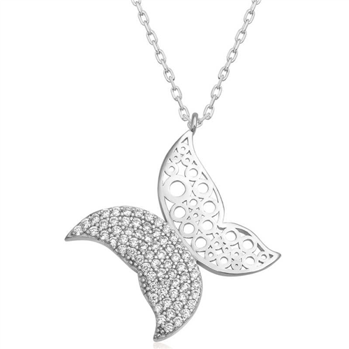 Silver Butterfly Women's Necklace Butterfly is one of the most popular motifs preferred by women. It reminds lovers of the mystery of nature and the richness of human imagination. Symbolizing freedom, innocence, and purity, butterflies are an expression of pure love and affection. A butterfly women's necklace, which you and your loved ones will enjoy wearing, will be one of the best gifts for your loved one. The necklace is made of 925 sterling silver. Rhodium plating is applied to the silver. Rhodium-plated silver women's necklaces preserve their shine for a long time and delay oxidation. The average silver chain length is 45 cm. Like all silver women's necklaces, the silver butterfly women's necklace model is also handmade. Due to silver and precious stones, there may be a ± 10% deviation in the average product weight. Width: 2.00 cm Length: 1.90 cm Average Weight: 2.60 gr.
