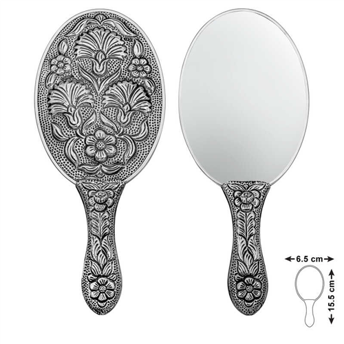 Silver Carnation Motif Hand Mirror Our products are the most beautiful silver accessories that you can gift to you and your loved ones. With their unique eye-catching designs, they are suitable for carrying in your bag. The product will be sent in a gift package... All of our products are handmade. and due to precious stones, there may be ± 5% deviation in product weight. Mirror Width: 6.50 cm Mirror Length: 15.50 cm Average Weight: 67 gr