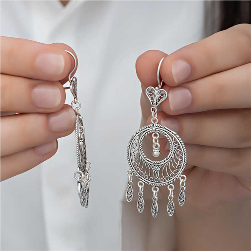 Silver Circle Filigree Dangle Women's EarringsThis specially designed, handmade circle filigree dangling women's earring model is made of 925 sterling silver. Also known as Mardin filigree, the earring model is handcrafted by curling silver wires. You can gift the silver filigree dangling women's earrings to your lover or all your loved ones on your birthday, anniversary, New Year's Day and Valentine's Day. Due to silver and precious stones, there may be a ± 10% deviation from the average product weight.Necklace Width: 2.60 cmNecklace Length: 6.50 cmAverage Weight: 9.30 gr.