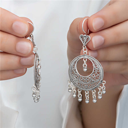 Silver Circle Filigree Dangle Women's EarringsThis specially designed, handmade circle filigree dangling women's earring model is made of 925 sterling silver. Also known as Mardin filigree, the earring model is handcrafted by curling silver wires. You can gift the silver filigree dangling women's earrings to your lover or all your loved ones on your birthday, anniversary, New Year's Day and Valentine's Day. Due to silver and precious stones, there may be a ± 10% deviation from the average product weight.Necklace Width: 2.90 cmNecklace Length: 6.50 cmAverage Weight: 13.30 gr.