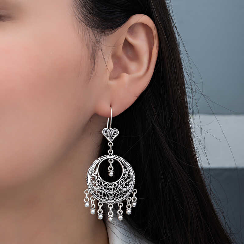 Silver Circle Filigree Dangle Women's EarringsThis specially designed, handmade circle filigree dangling women's earring model is made of 925 sterling silver. Also known as Mardin filigree, the earring model is handcrafted by curling silver wires. You can gift the silver filigree dangling women's earrings to your lover or all your loved ones on your birthday, anniversary, New Year's Day and Valentine's Day. Due to silver and precious stones, there may be a ± 10% deviation from the average product weight.Necklace Width: 2.90 cmNecklace Length: 6.50 cmAverage Weight: 13.30 gr.
