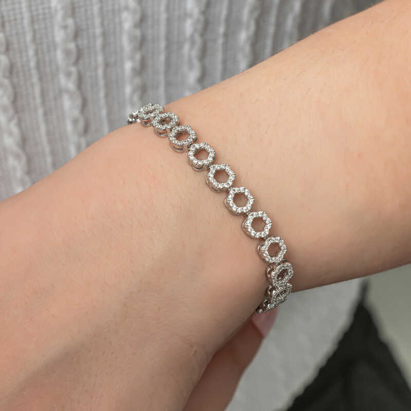 Silver Circle White Stone Waterway Women's BraceletYou will love using this bracelet, which resembles stars with its sparkling stones, for everyday use, special occasions, and nights out. This timeless silver bracelet with stones is waiting for you, appealing to all women who want to create a stylish look. The silver white stone waterway women's bracelet is a perfect option for a birthday gift, Valentine's Day gift, or as a gift for mothers on special occasions. The silver circle white stone waterway women's bracelet is made of 925 sterling silver. Rhodium plated on the silver. Rhodium plated women's bracelet preserves its shine for a long time and oxidation is delayed. Like all women's bracelets, the silver circle white stone waterway women's bracelet is also handmade. Due to silver and precious stones, there may be a ± 10% deviation in the average product weight.Bracelet Diameter: 0.70 cmBracelet Length: 21 cmAverage Weight: 9.40 gr.