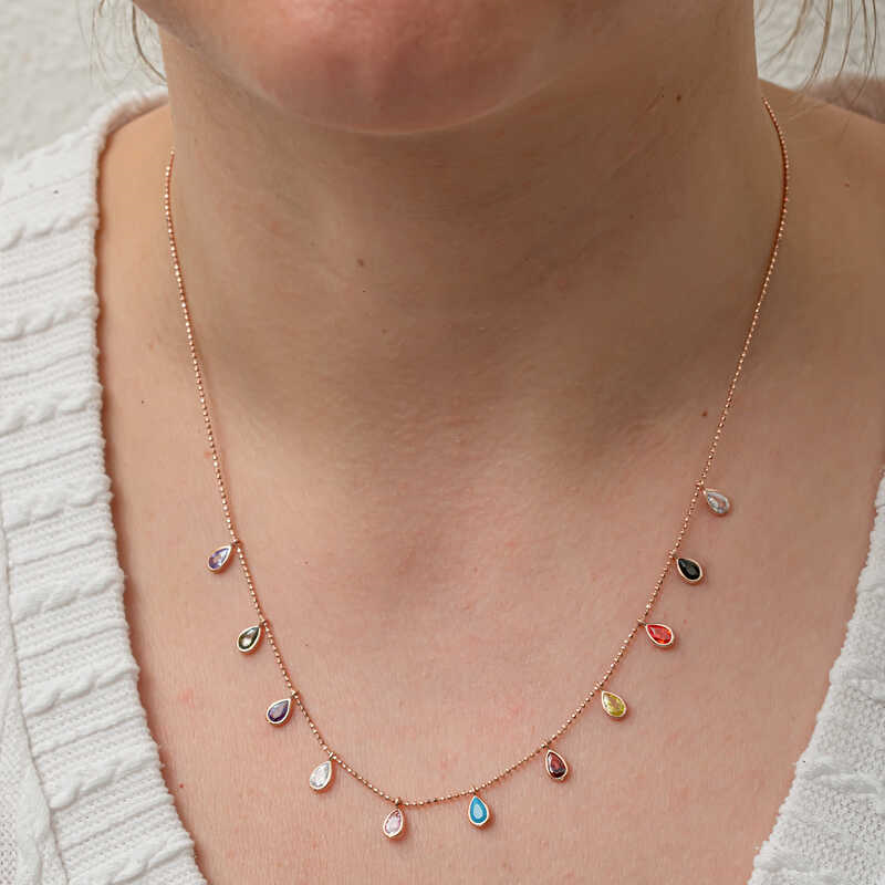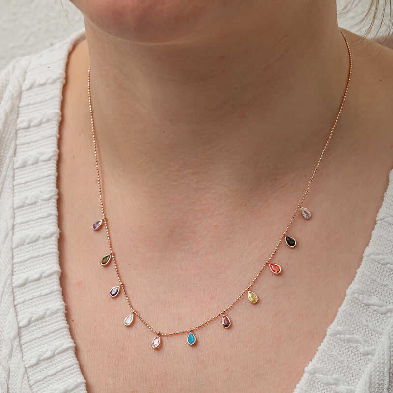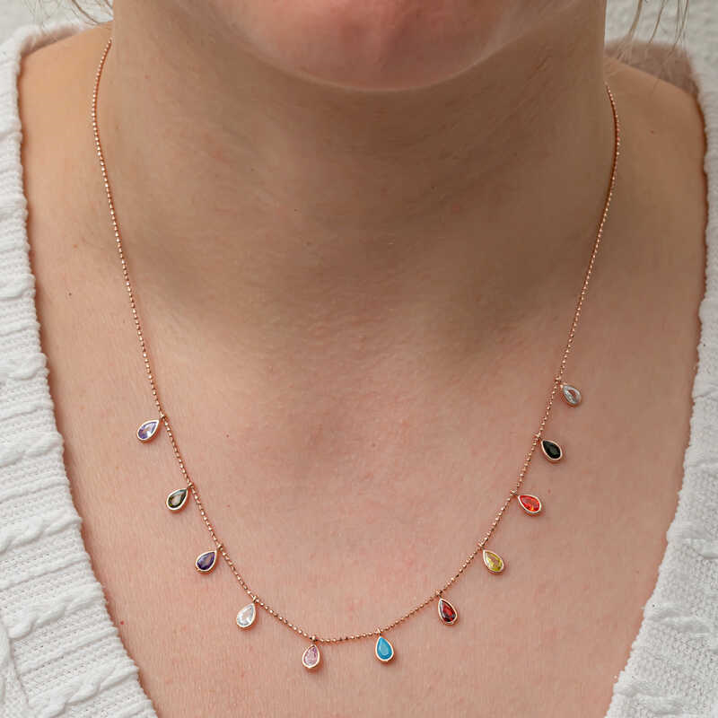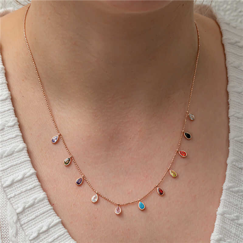 Silver Colored Drop Stone Luck Women's Necklace Specially designed colorful necklaces that are the reflection of our colorful imagination, which is the most fun side of our heart and soul... This stylish necklace is a perfect option to choose on special occasions as a birthday gift, Valentine's Day gift or a gift for mothers. Colorful women's necklace is made of 925 sterling silver. Rose plated silver. Rose plated women's luck necklaces preserve their shine for a long time and oxidation is delayed. As with all silver necklaces, the silver colored women's necklace model is also handmade. Due to silver and precious stones, there may be ± 10% deviation in the average product weight. Width: 0.30 cm Length: 0.80 cm Avg. Weight: 2.90 gr. Chain Length: 45.00 cm