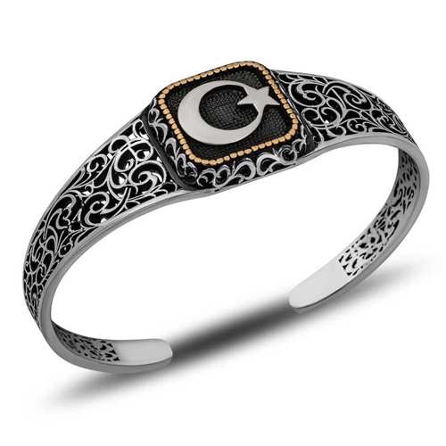 Silver Crescent Star Adjustable Cuff Men's Bracelet The crescent star symbol has an important place in Turkish culture and is often associated with concepts such as nationalism, Turkishness, Islam and independence. The use of this symbol in adjustable men's bracelets can indicate the person wearing it's commitment to these values or their desire to represent these values. A silver bracelet is an excellent option as a birthday gift, Valentine's Day gift or a gift on other special occasions. Oxidized silver is coated. Silver bracelets with oxide coating preserve their shine for a long time. Due to silver and precious stones, there may be ± 10% deviation from the average product weight. Bracelet Width: 2 cm Bracelet Diameter: 7 cm Avg. Weight: 36.00 gr.