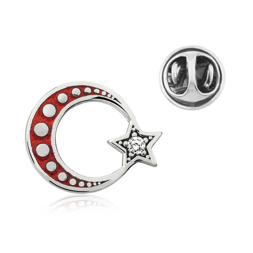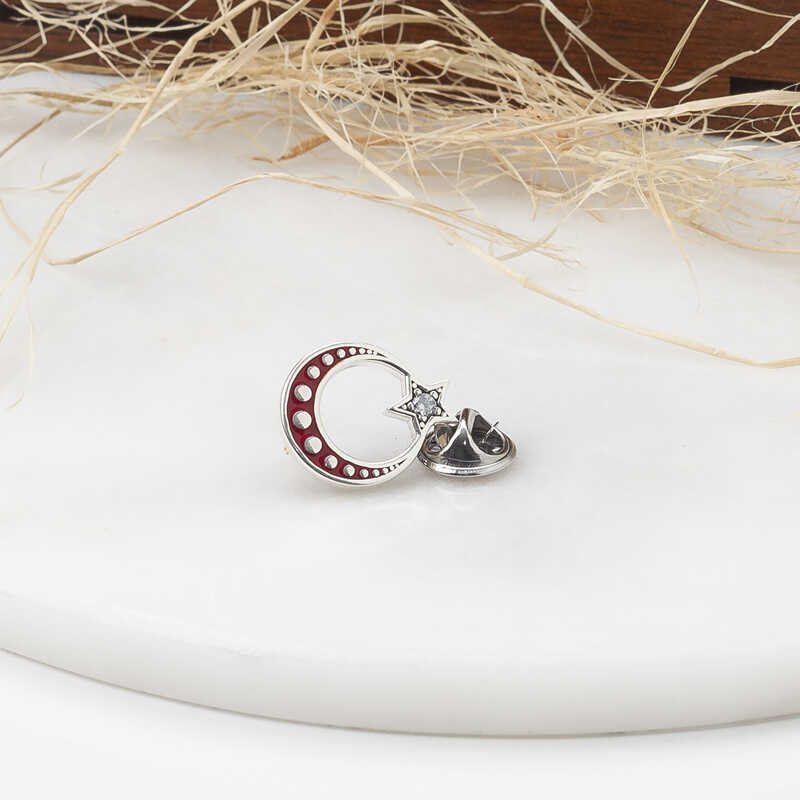 Silver Crescent Star Badge We know that the Turkish flag takes its inspiration from the crescent and star reflected in a lake of blood. We offer you an unmissable opportunity to carry the sacred meaning of the flag and share it with your loved ones. This stylish badge is a perfect gift option for birthdays, Father's Day or special occasions. This badge model is made of 925 sterling silver. Rhodium plated silver. Rhodium plated silver badge models preserve their shine for a long time and oxidation is delayed. Like all silver badges, the silver crescent star badge model is produced entirely by hand. Due to silver and precious stones, there may be a ± 10% deviation in the average product weight. Width: 2.00 cm. Length: 1.60 cm. Average Weight: 3.37 Gr